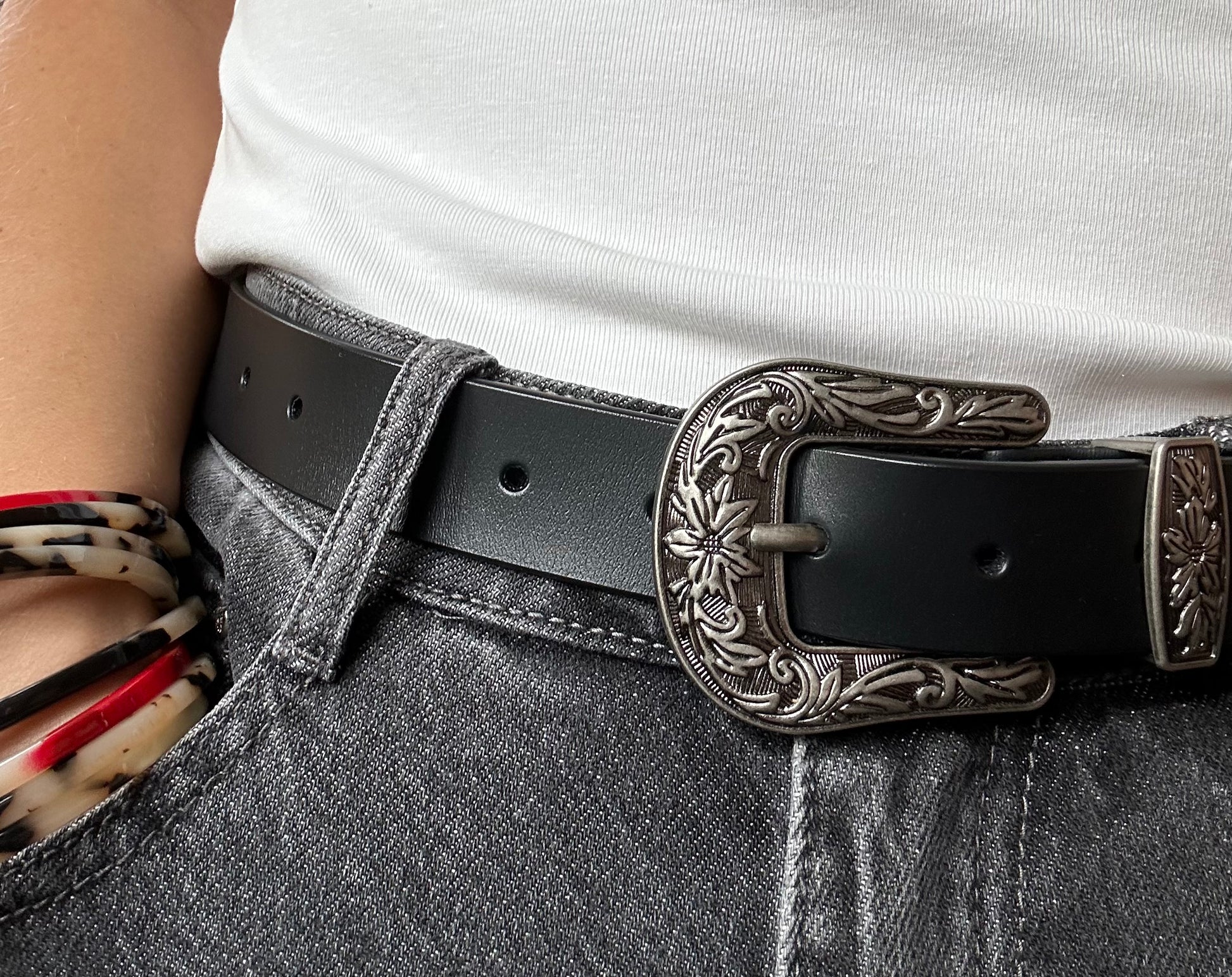 Ceinture en cuir noir et métal