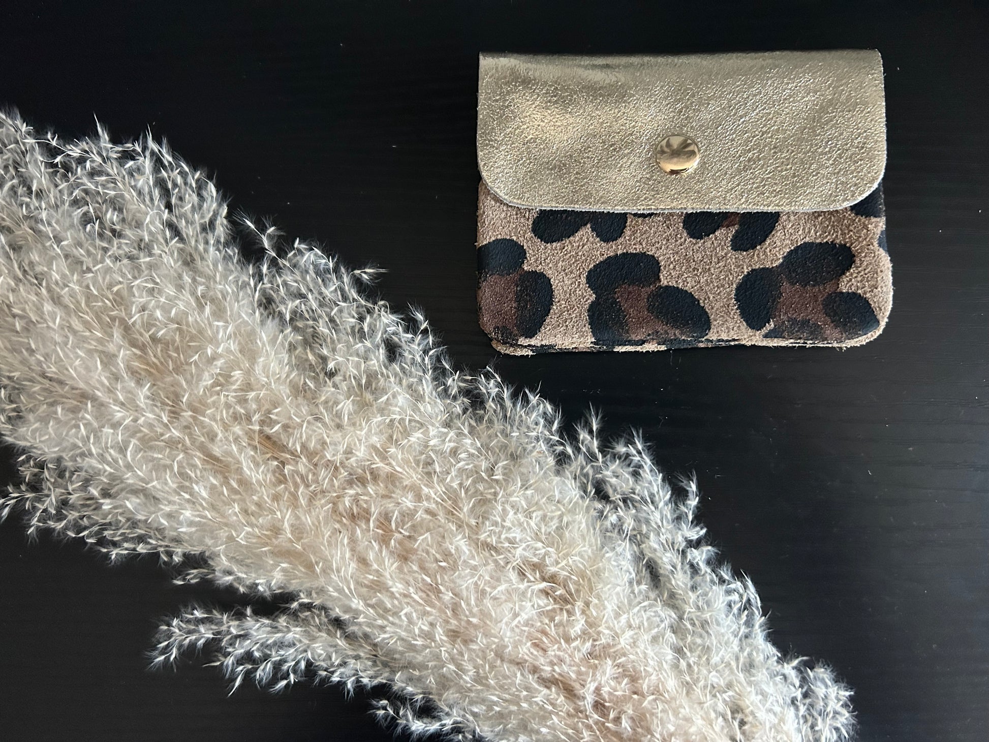 Porte Monnaie en cuir doré et daim léopard